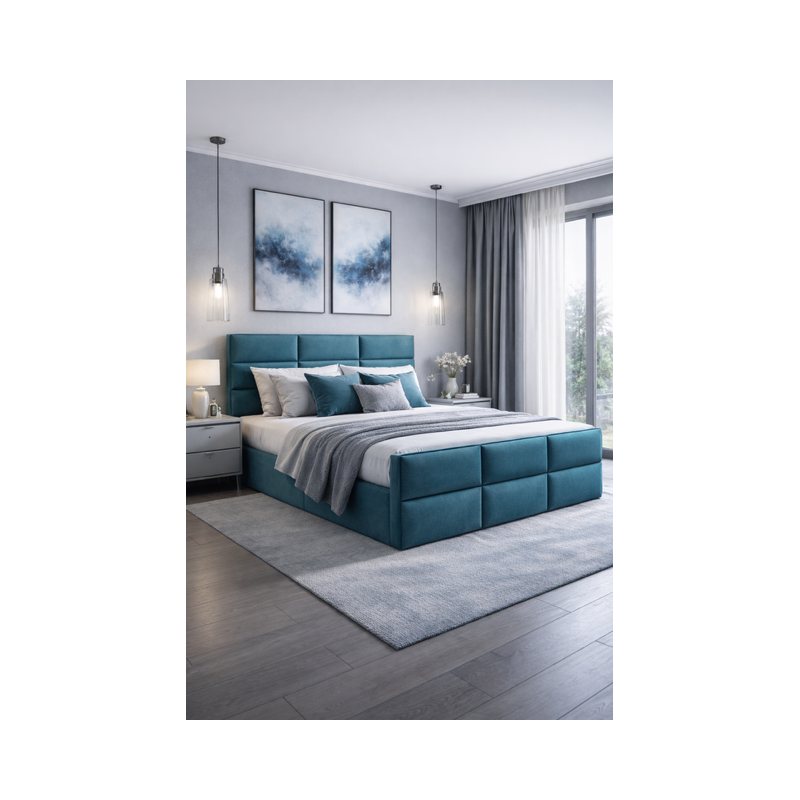 Nowoczesny wzór, sprawi że będzie bardzo dobrze prezentować się w każdej sypialni w różnych aranżacjach. Piękny wygląd to nie jedyna zaleta tego modelu. Łóżko tapicerowane w miękkiej i przyjemnej tkaninie w dotyku. Wezgłowie panelowe, bardzo miękkie, składające się z 6 równych paneli. Łóżko posiada dwa duże pojemniki, łatwo podnoszone do góry dzięki automatom sprężynowym. Posiada również, wbudowane, przymocowane do stelaża bardzo dobrej jakości wysokie materace bonellowe. Dopełnieniem całości jest materac ochronny nawierzchniowy inaczej zwany toperm.