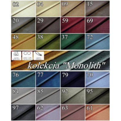 Tkanina Monolith jest tkaniną typu melanż, której delikatny deseń przypomina nieco kaszmir. Takie właściwości sprawiają, że materiał nie jest całkowicie gładki i nadaje tapicerowanym meblom wyjątkowej lekkości. Tkanina ta cechuje się wysoką wytrzymałością na wycieranie, która w skali Martindale'a wynosi aż 100 000 jednostek. To plamoodporna i elegancka tkanina, mocna ale jednocześnie miła w dotyku. Wzbogacony specjalną powłoką hybrydową, która zabezpiecza przed wnikaniem cieczy w strukturę tkaniny. Ten ładny i wytrzymały materiał świetnie sprawdzi się w każdym domu oraz w lokalach użytku publicznego. To również świetna tkanina dla dzieci i materiał odporny na zwierzęta.